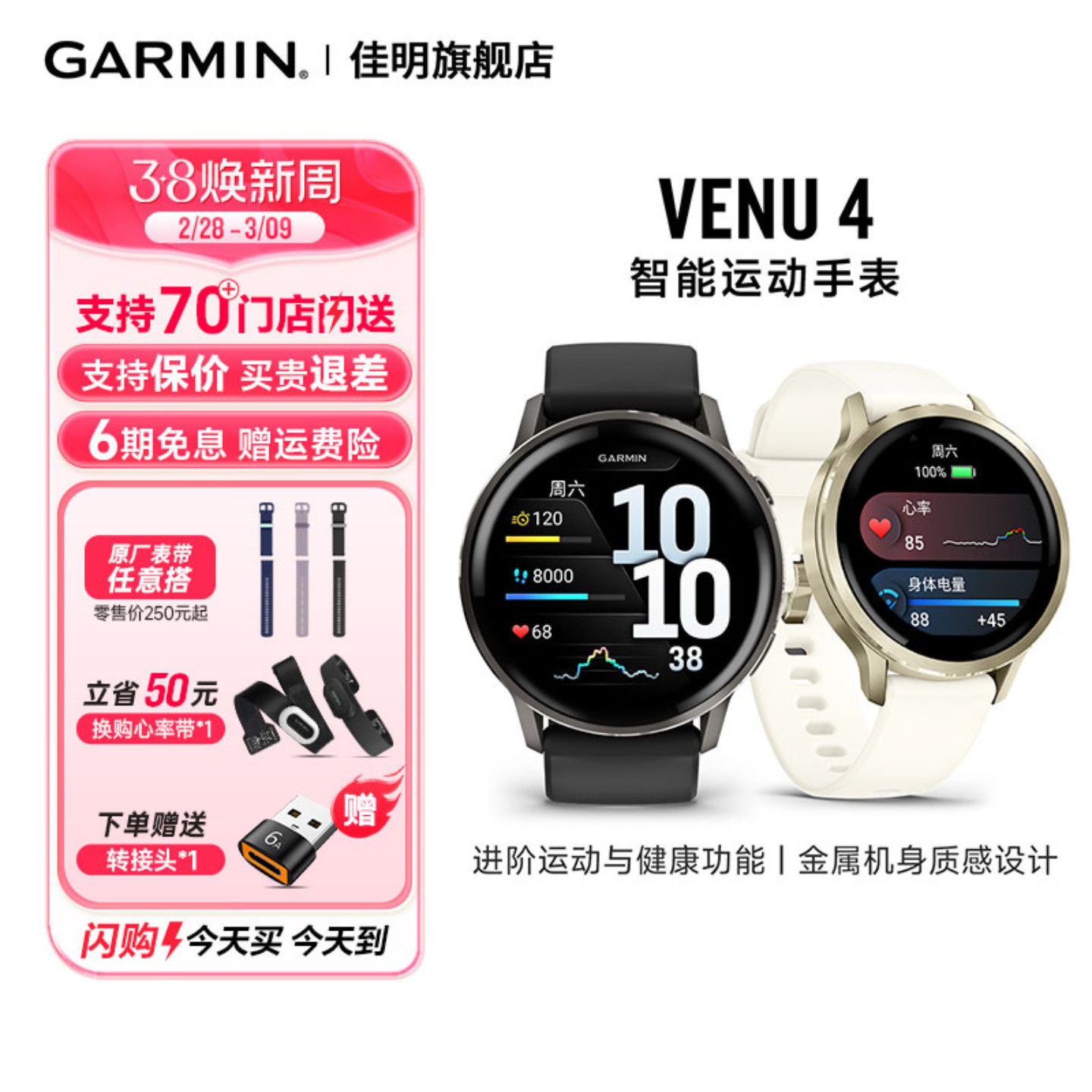 【自营】【88VIP95折】佳明(GARMIN)Venu4智能手表 多频多星LED手电筒 蓝牙通话 健身瑜伽跑步游泳防水心率