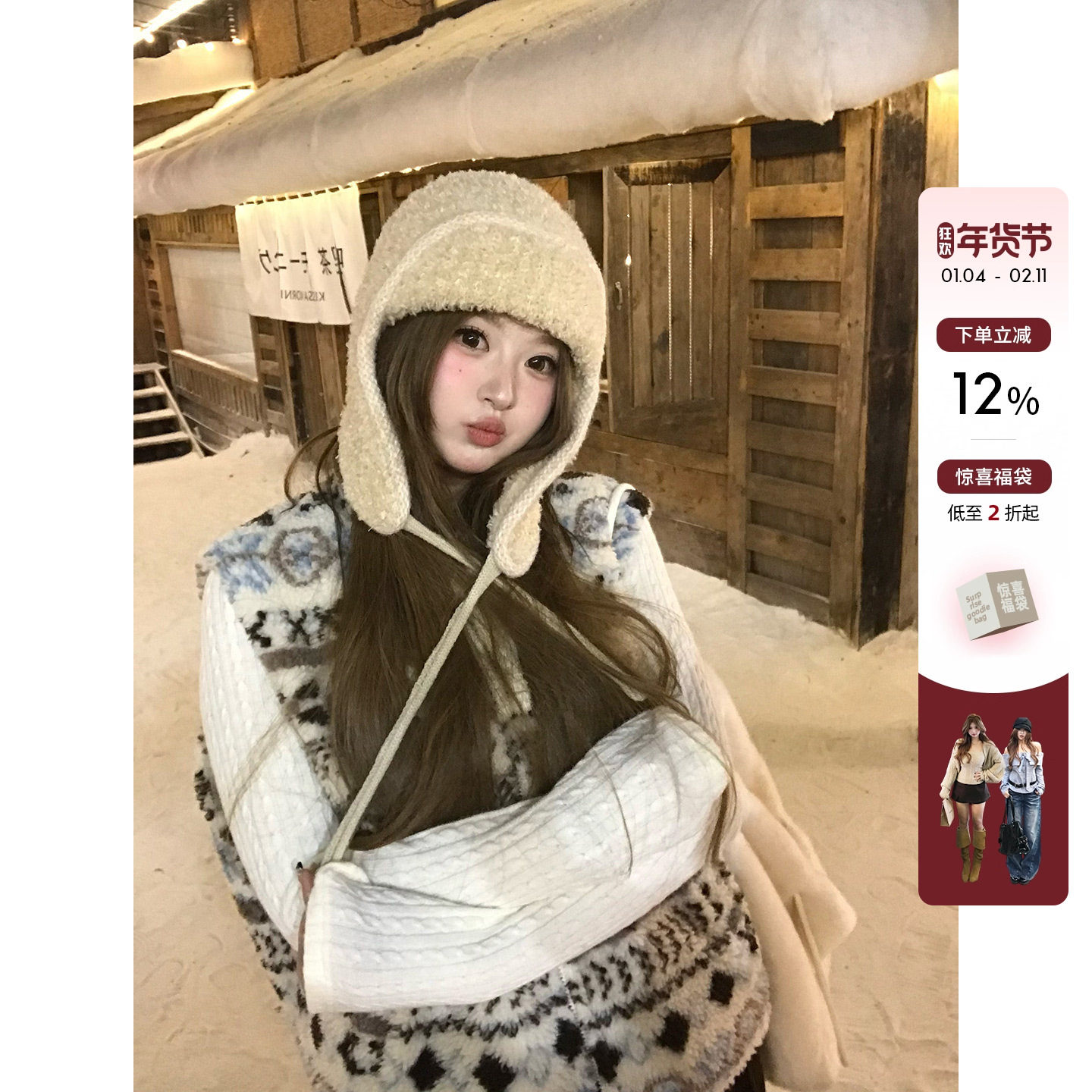 你的鱼 芬兰冬日 韩系微胖mm费尔岛马甲保暖上衣灯芯绒长裤套装