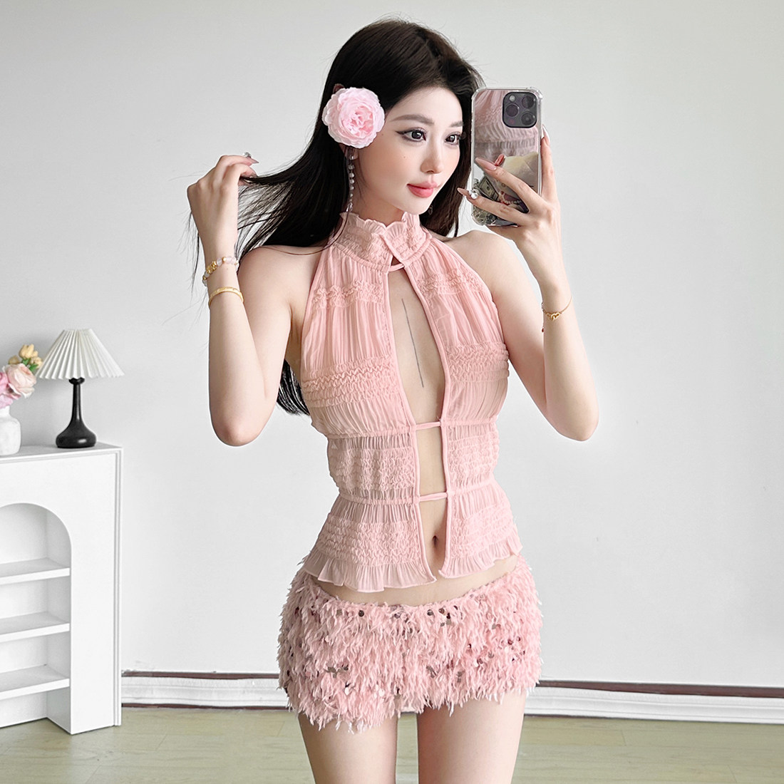 #Sisjuly#性感名媛辣妹风亮片bling露背上衣 毛毛修身短裤套装女