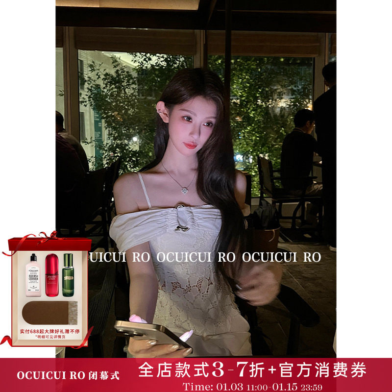 CUICUI崔崔【潇湘书院】法式蕾丝镂空设计感一字肩上衣直筒裤套装
