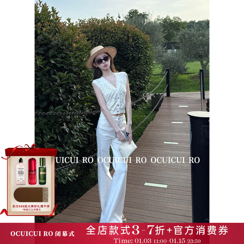 CUICUI崔崔【华清引】白色V领钩花镂空针织马甲背心阔腿长裤套装