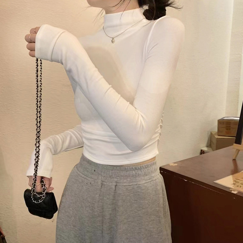 小个子短款德绒半高领打底衫女内搭秋冬修身长袖T恤褶皱上衣潮ins