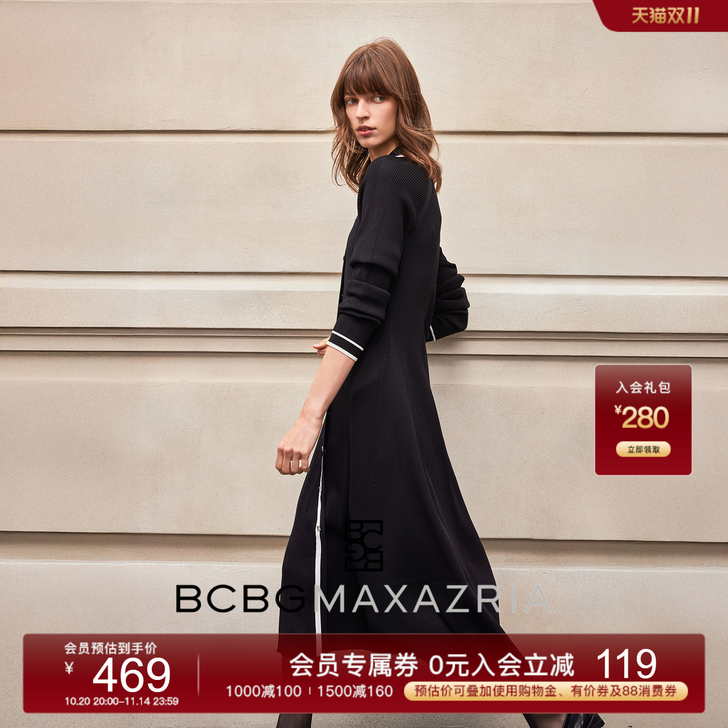 BCBG25秋冬新款时尚通勤设计感撞色垂坠感修身小香风针织女连衣裙