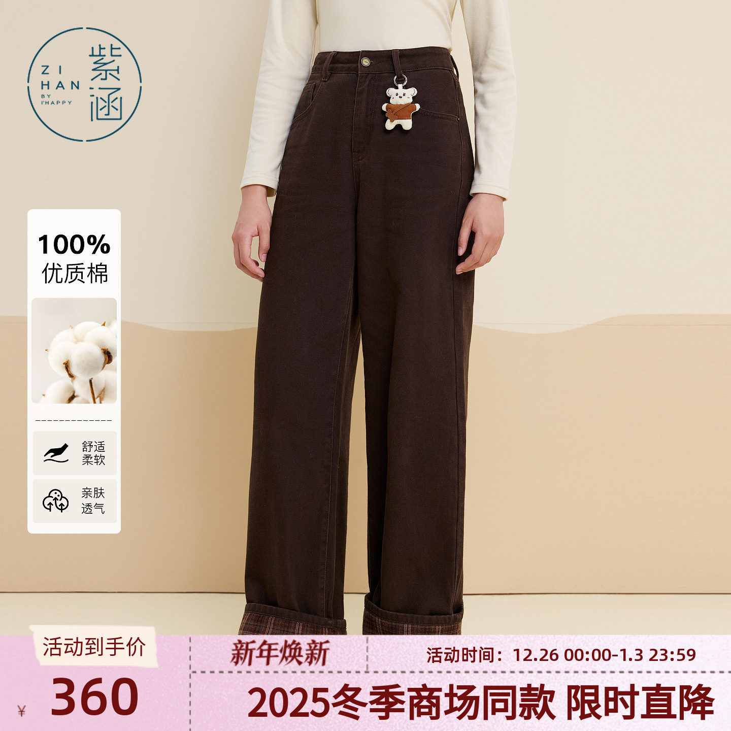 紫涵复古直筒牛仔裤女2025年冬季新款卷边撞色格纹宽松棕色休闲裤