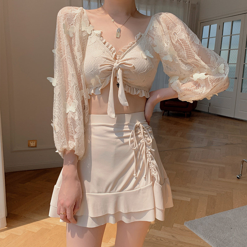温泉显瘦遮肚分体泳衣女性感纯欲蕾丝海边度假长袖防晒罩衫两件套