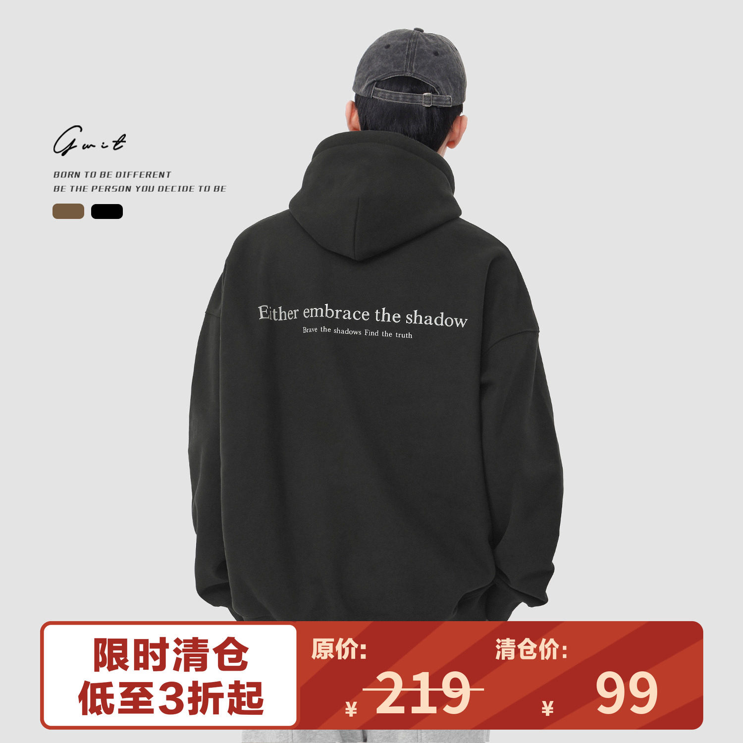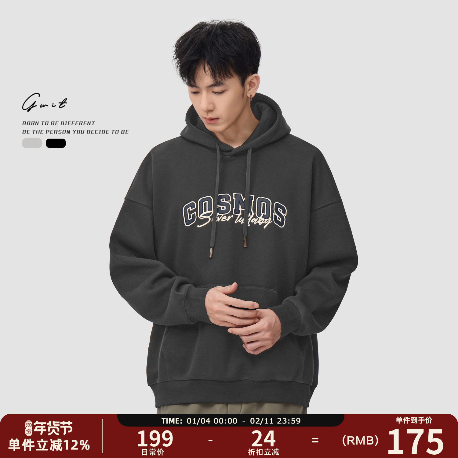 GWIT 重磅复古潮牌刺绣冬季保暖套头打底帽衫加绒加厚连帽卫衣男