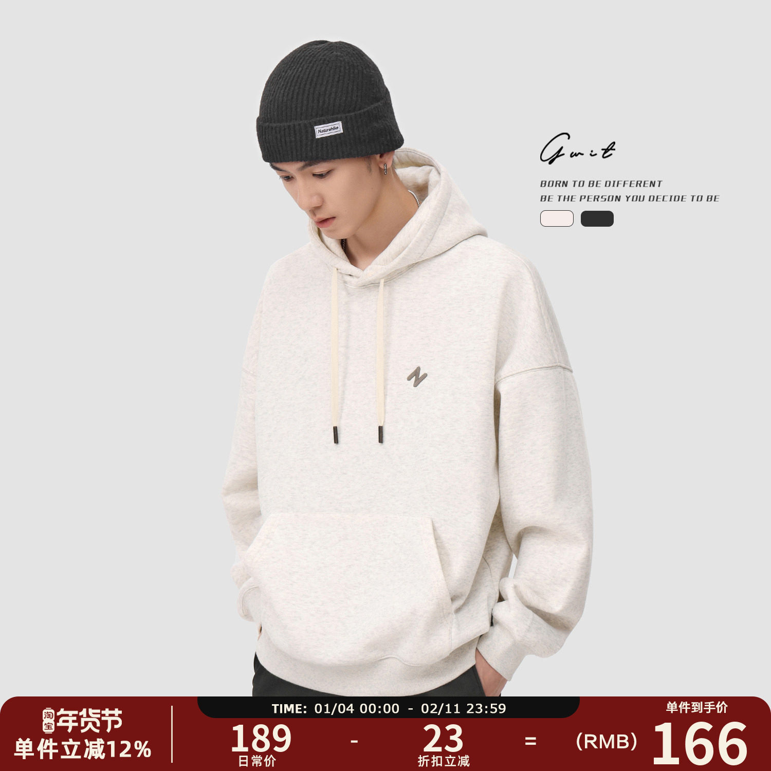 GWIT 基础款潮牌刺绣冬季保暖套头打底衫帽衫加绒加厚连帽卫衣男