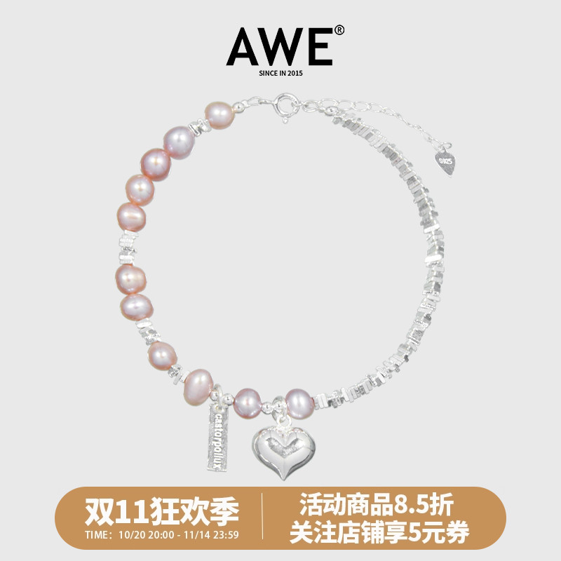 AWE粉色少女淡水珍珠S925纯银爱心手链女银饰碎银子手串闺蜜礼物