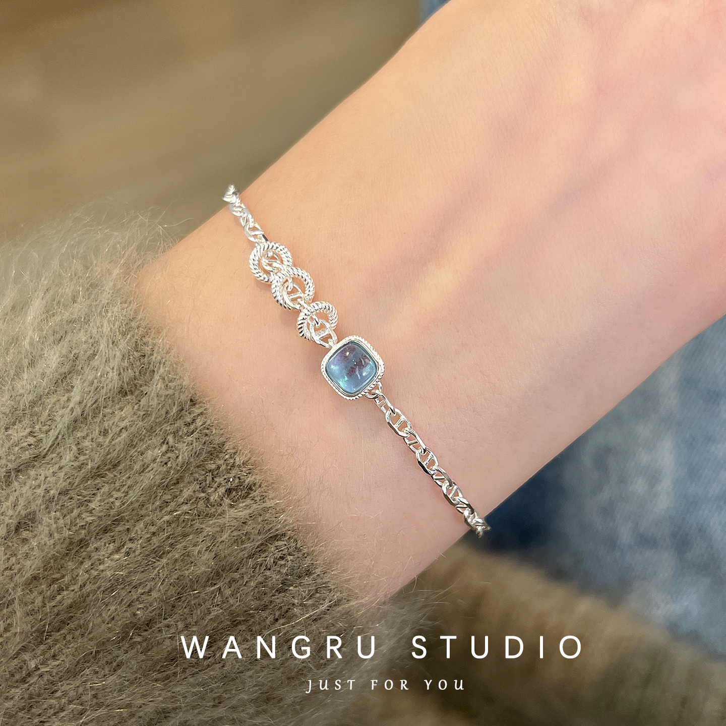 纯银手链女轻奢小众精致高级感原创设计风生日礼物天然海蓝宝首饰