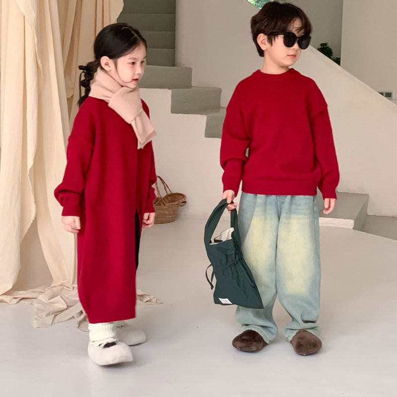 女童男童洋气毛衣秋冬款儿童中长款红色针织衫新年过年姐弟兄妹装