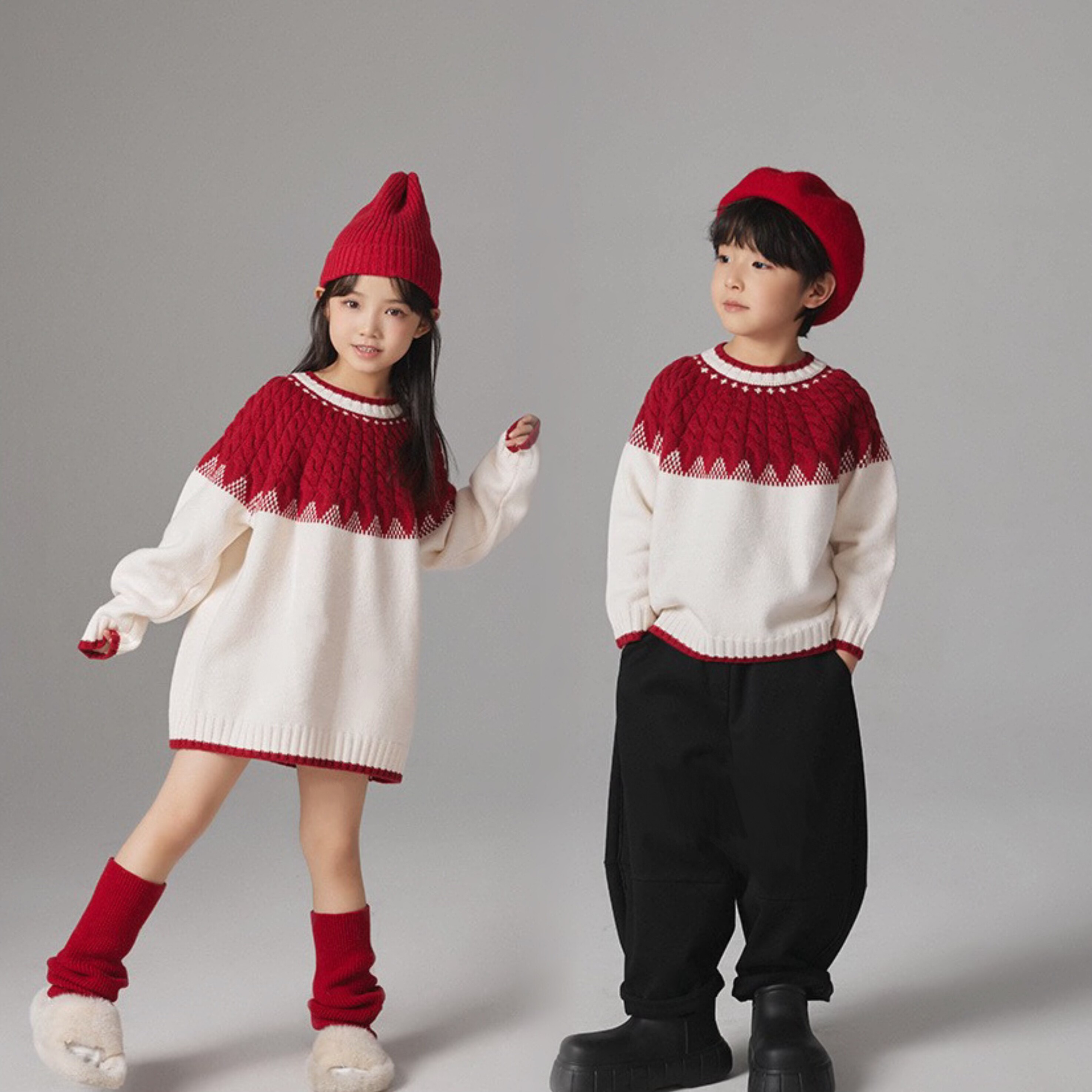 男女童毛衣2025秋冬装儿童中长款针织裙圣诞过新年红色兄妹姐弟装