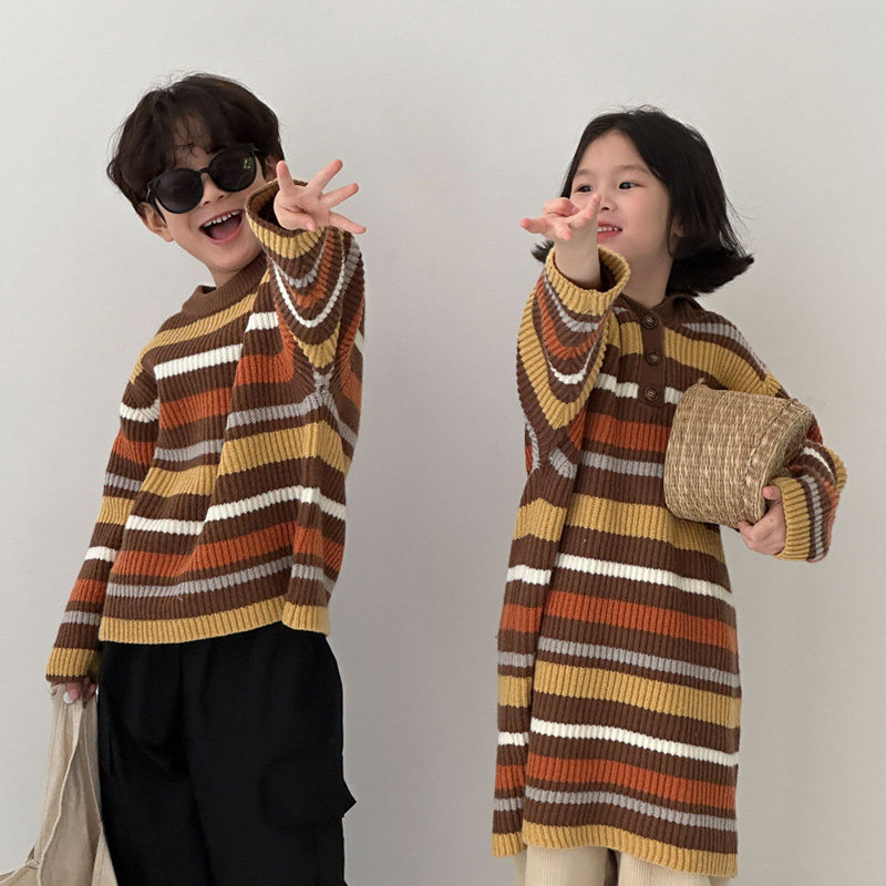 兄妹装秋冬儿童条纹毛衣女童长款毛衣裙连帽外套男童毛线衣姐弟装
