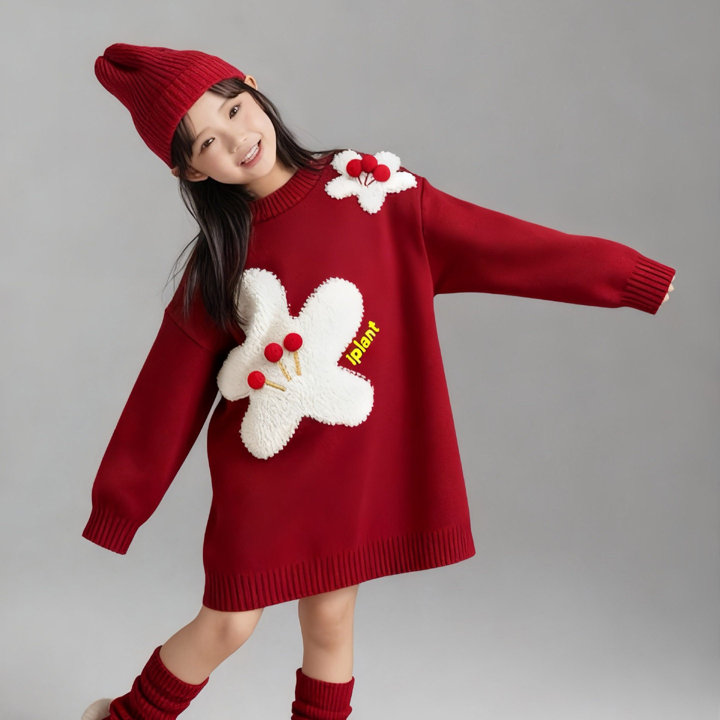 女童中长款毛衣裙秋冬款中大童个性红色针织衫宝宝过年红色毛线衣