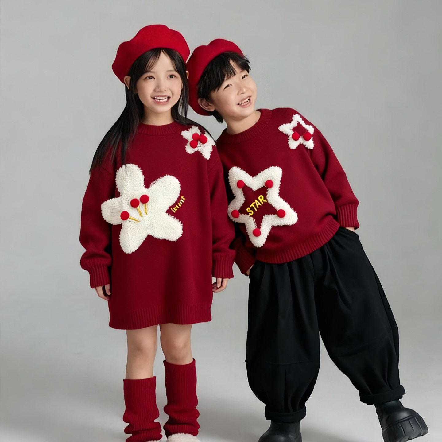 男女童毛衣2025秋冬装韩版儿童中长款红色针织衫兄妹姐弟装毛线衣