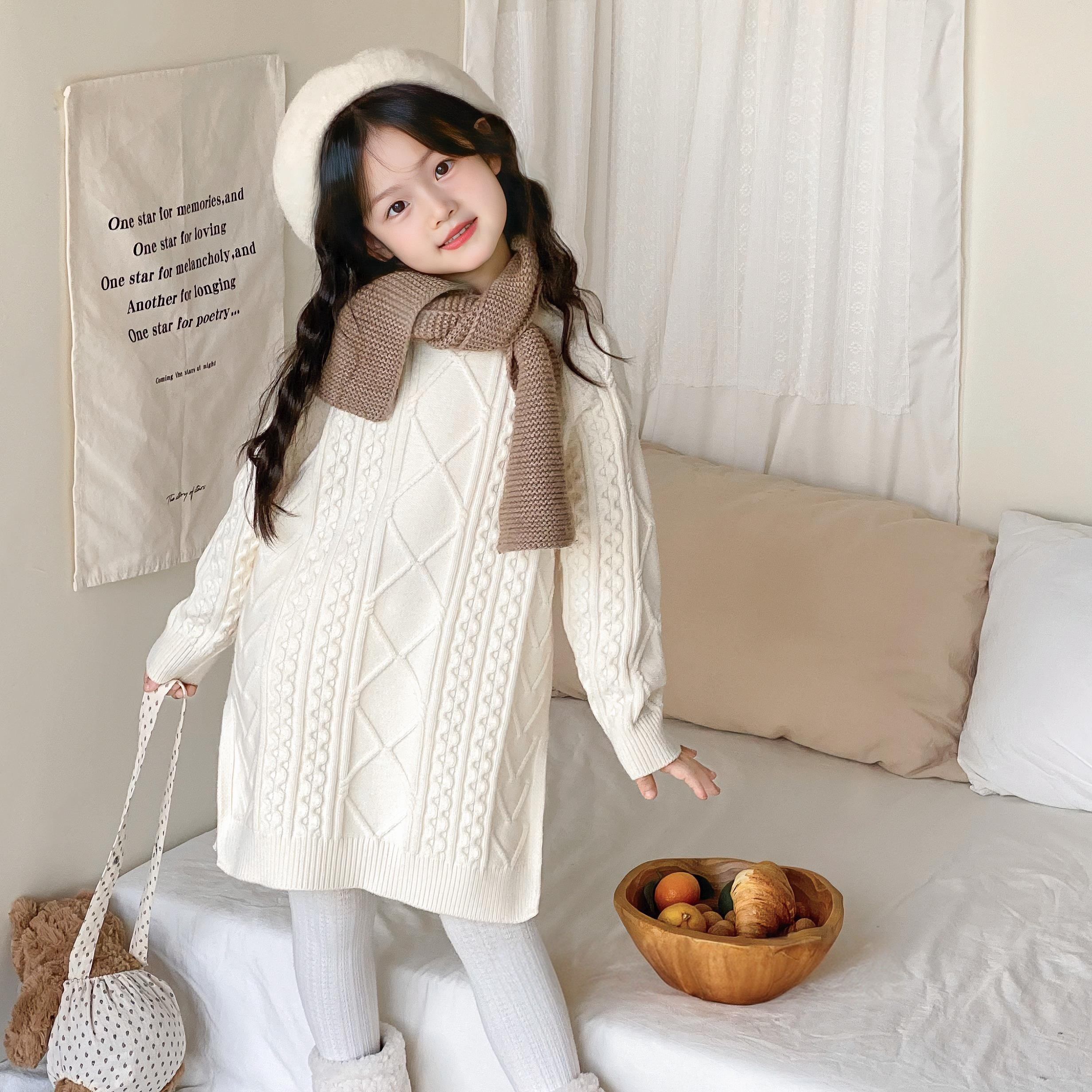 温柔系中长款白色女童毛衣韩版百搭中大童毛衣包臀加厚女童针织衫