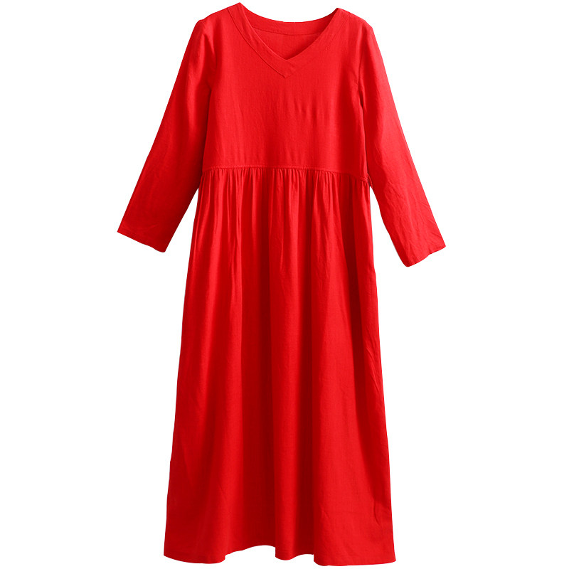 长袖红色棉麻连衣裙女宽松高腰大码亚麻长裙中长款复古旅行文艺秋