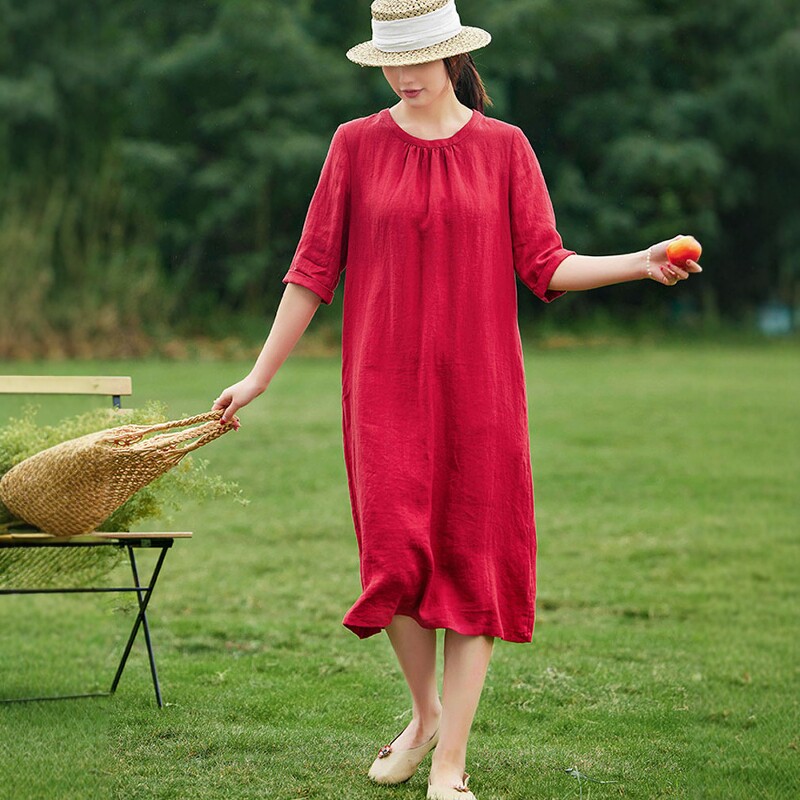 红/曲/十木米原创2022春秋中长裙旅行文艺亚麻沙滩国风红色连衣裙