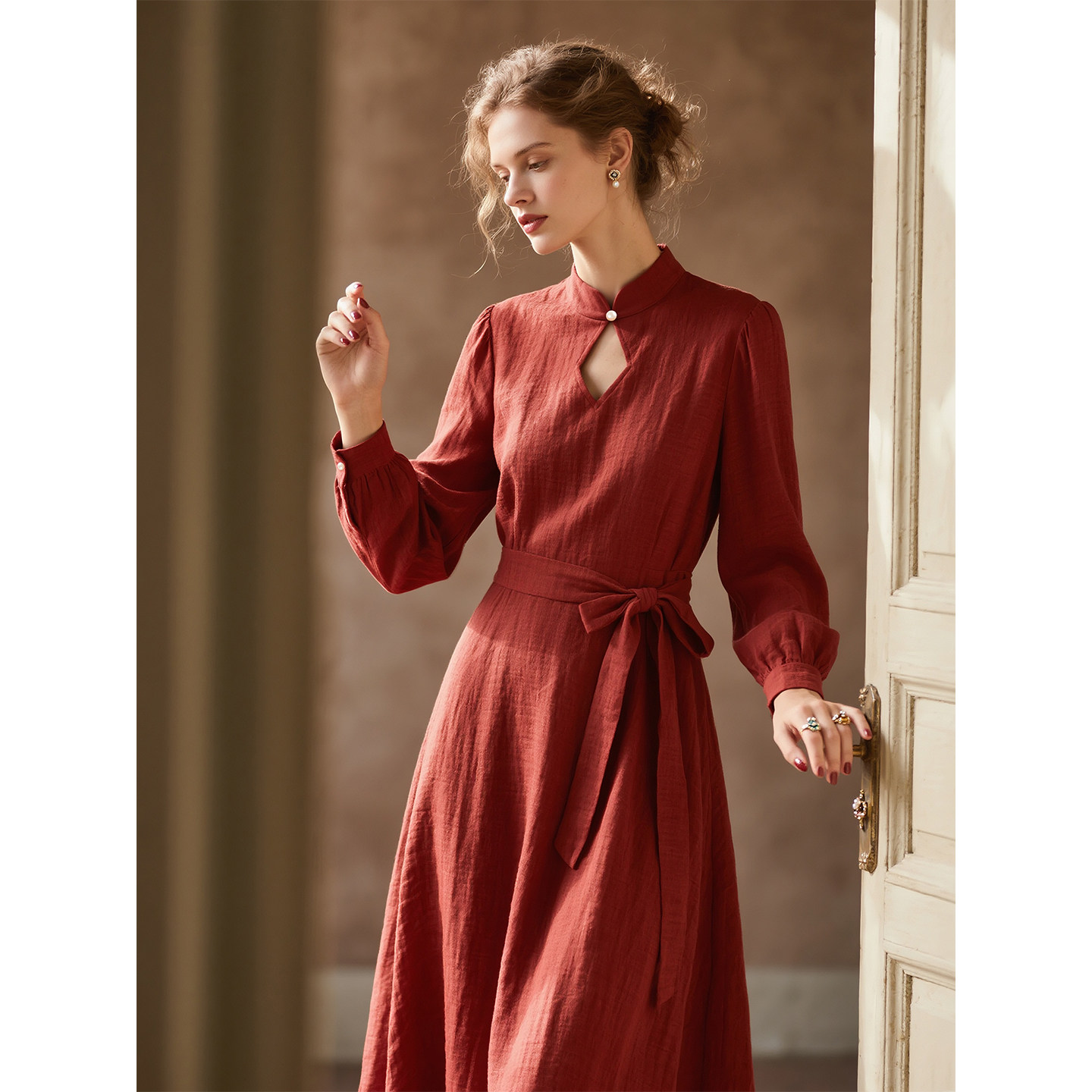 新中式红色亚麻立领连衣裙女2026年春季新款长袖收腰系带复古长裙