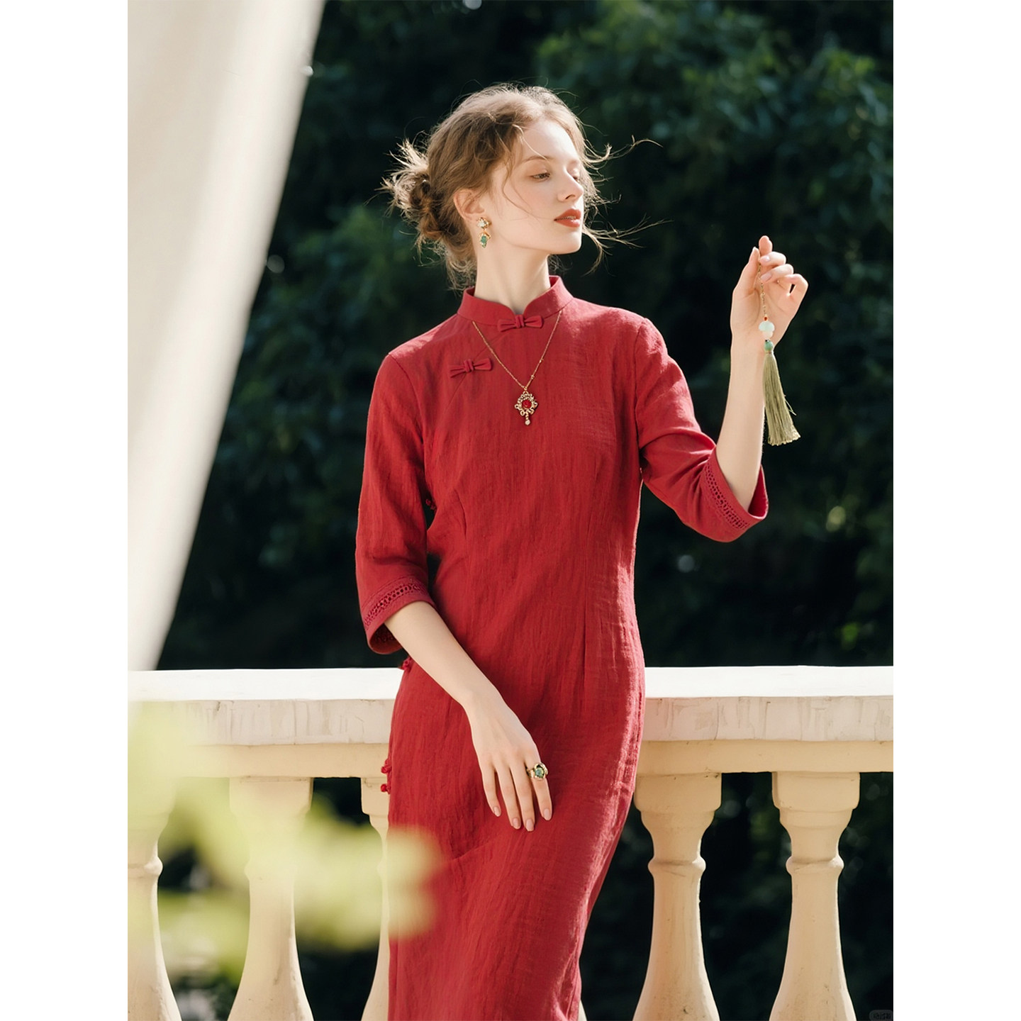 新中式红色亚麻连衣裙女2026春季新款复古立领盘扣收腰显瘦中长裙