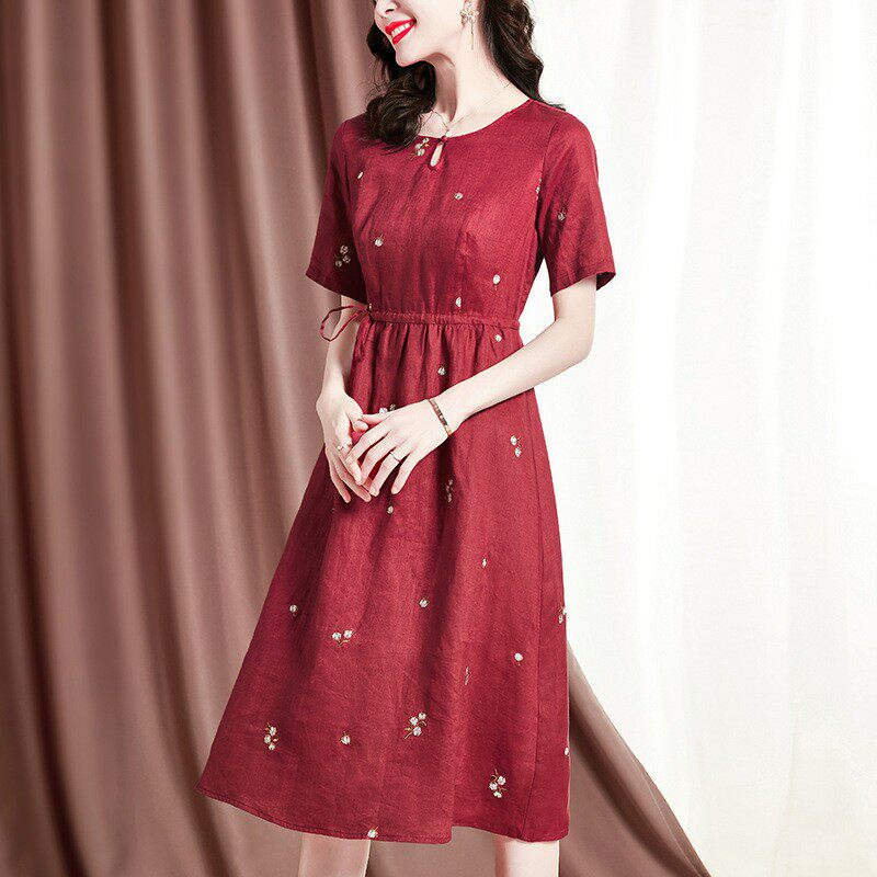 中年妈妈亚麻连衣裙纸样女2021夏装大码红色气质显瘦a字绣花长裙