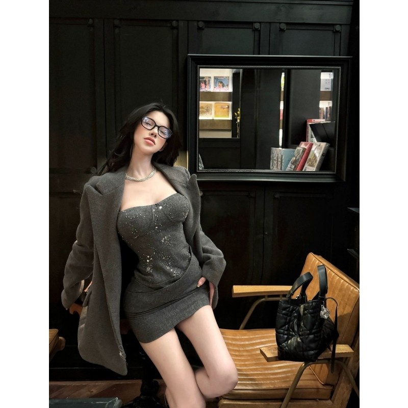 秋冬辣妹性感风亮片吊带包臀连衣裙气质西装宽松外套名媛风两件套