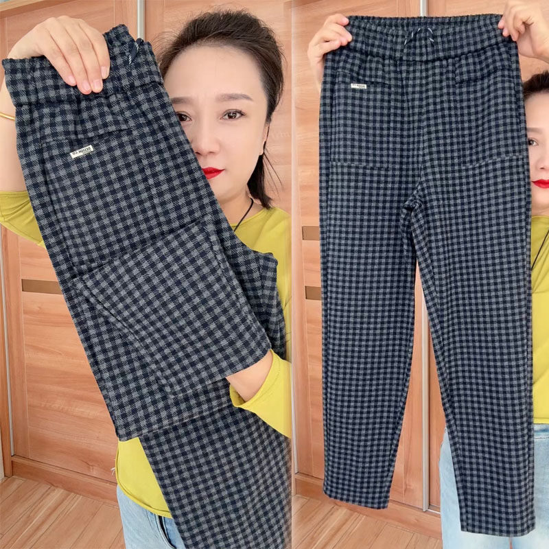 加绒加厚毛呢格子哈伦裤女2025秋冬新款小脚裤高腰显瘦休闲女裤子
