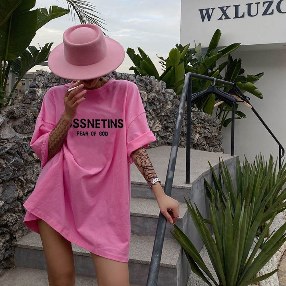 粉色字母短袖T恤女2025春夏印花宽松纯棉中长款遮屁股下衣失踪潮