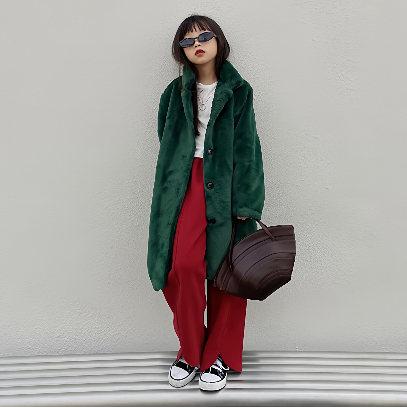 豆丁奇遇儿童秋冬男童女童中长款保暖仿皮草毛毛绿色外套大衣黑色