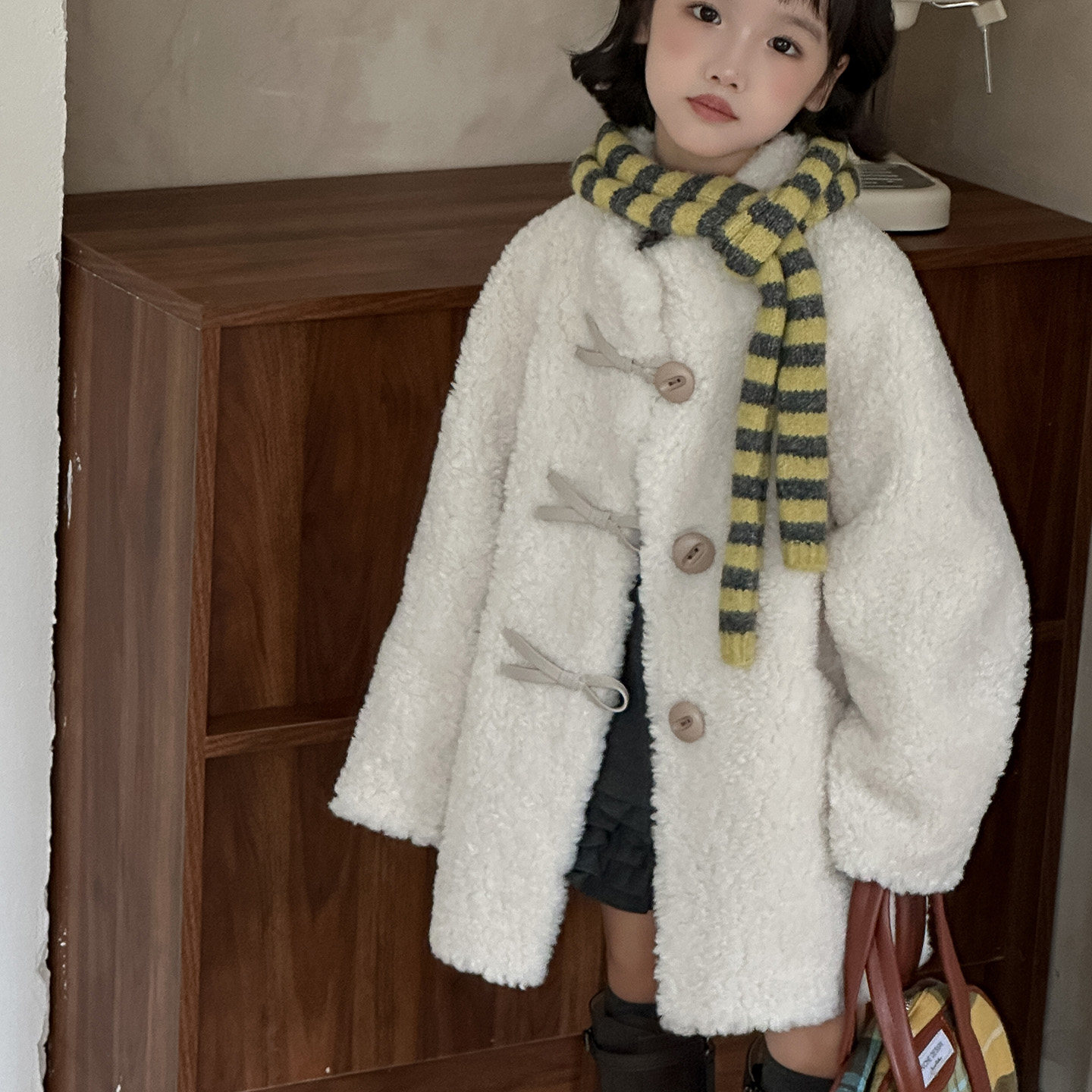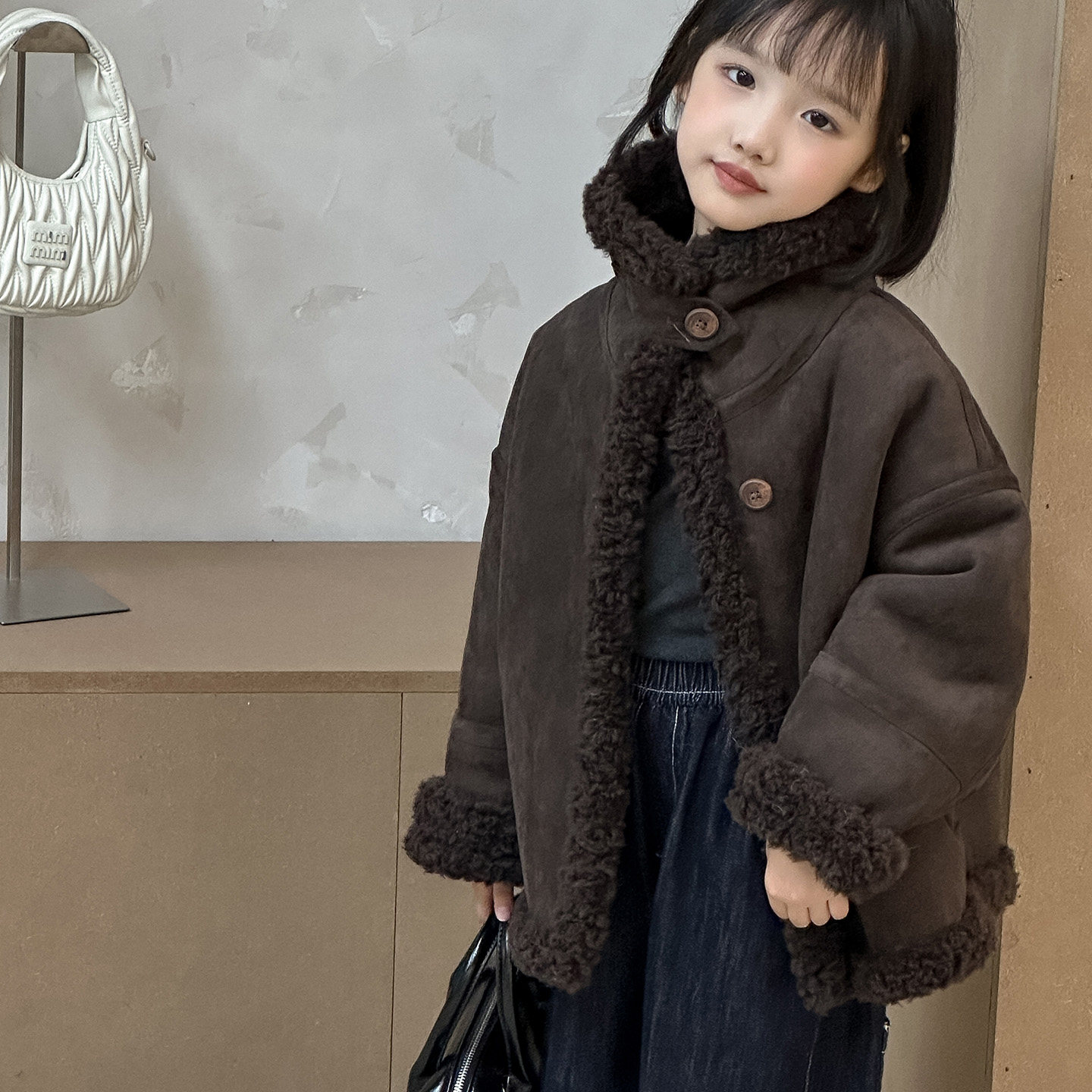 甜苏家2025颗粒毛复合皮毛一体立领牛角扣男女童潮童儿童皮草外套
