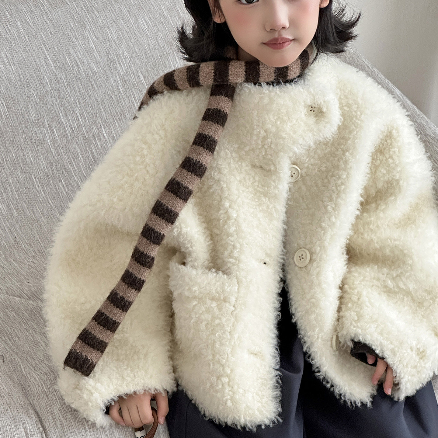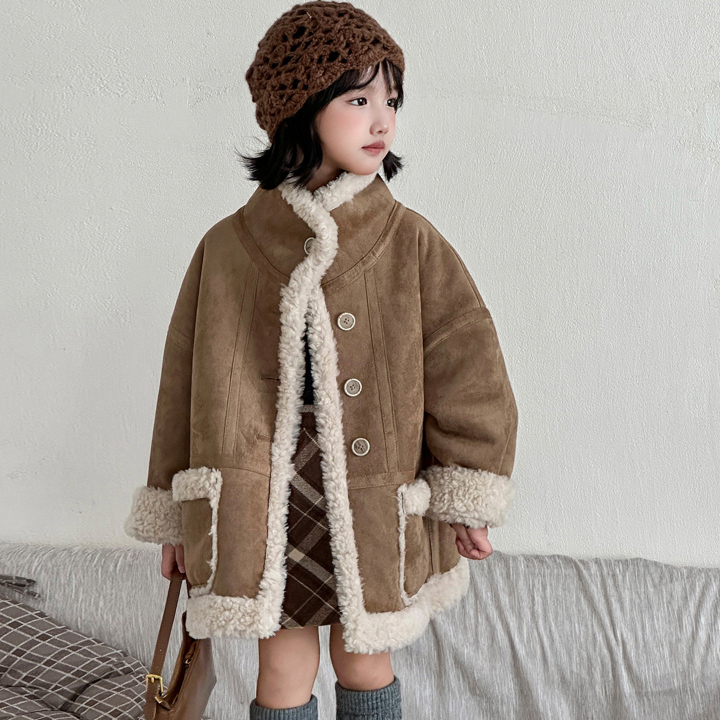 甜苏家新颗粒羊毛撞色格子小立领韩系时尚男女童个性儿童皮草外套