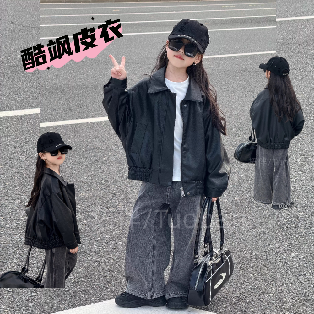 拓伴2025秋季儿童PU皮衣外套男女童短款夹克上衣夹克机车洋气潮酷