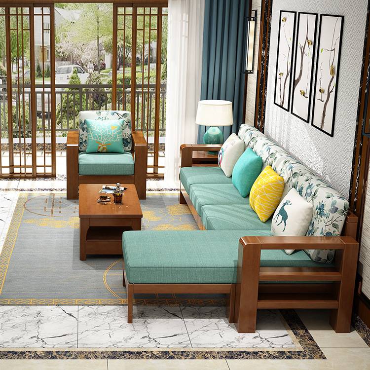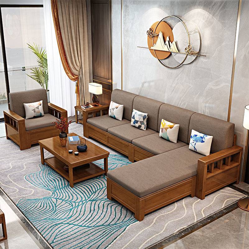 现代中式实木沙发组合客厅小户型木加布转角贵妃单椅沙发厂家直供