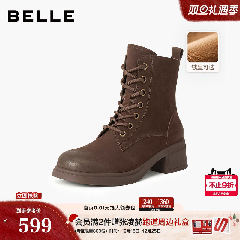 百丽女靴子厚底复古马丁靴冬新英伦风真皮短靴加绒时装靴D3F1DDD4