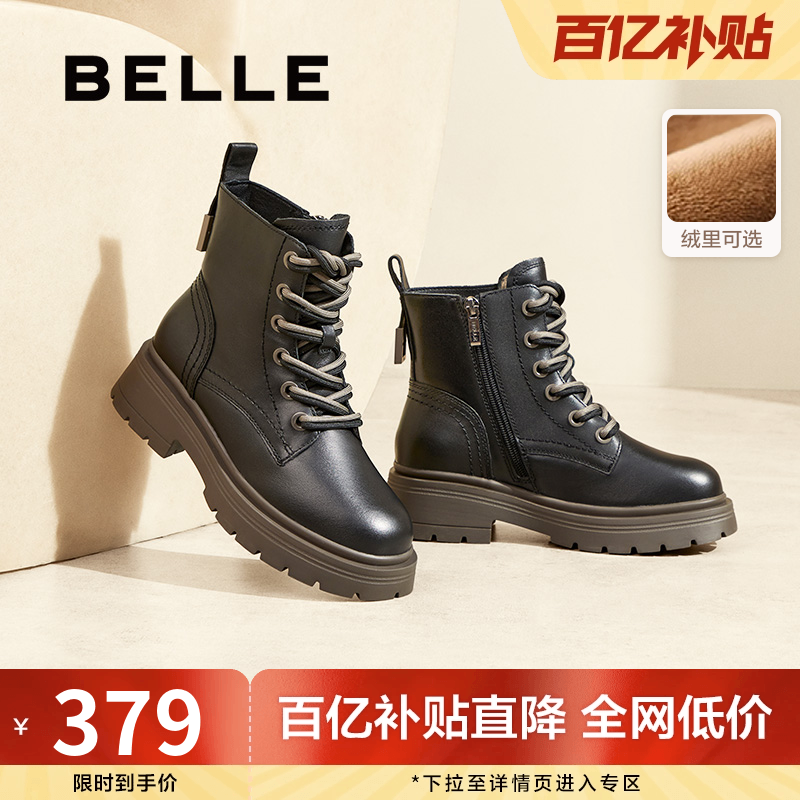 百丽英伦风马丁靴工装靴女鞋子冬新款真皮加绒羊皮短靴B7E2DDD4