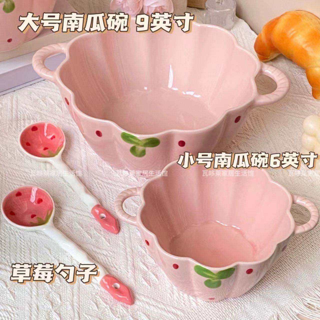 草莓粉双耳汤碗家用大容量螺蛳粉碗可爱少女心宿舍泡面碗勺高颜值