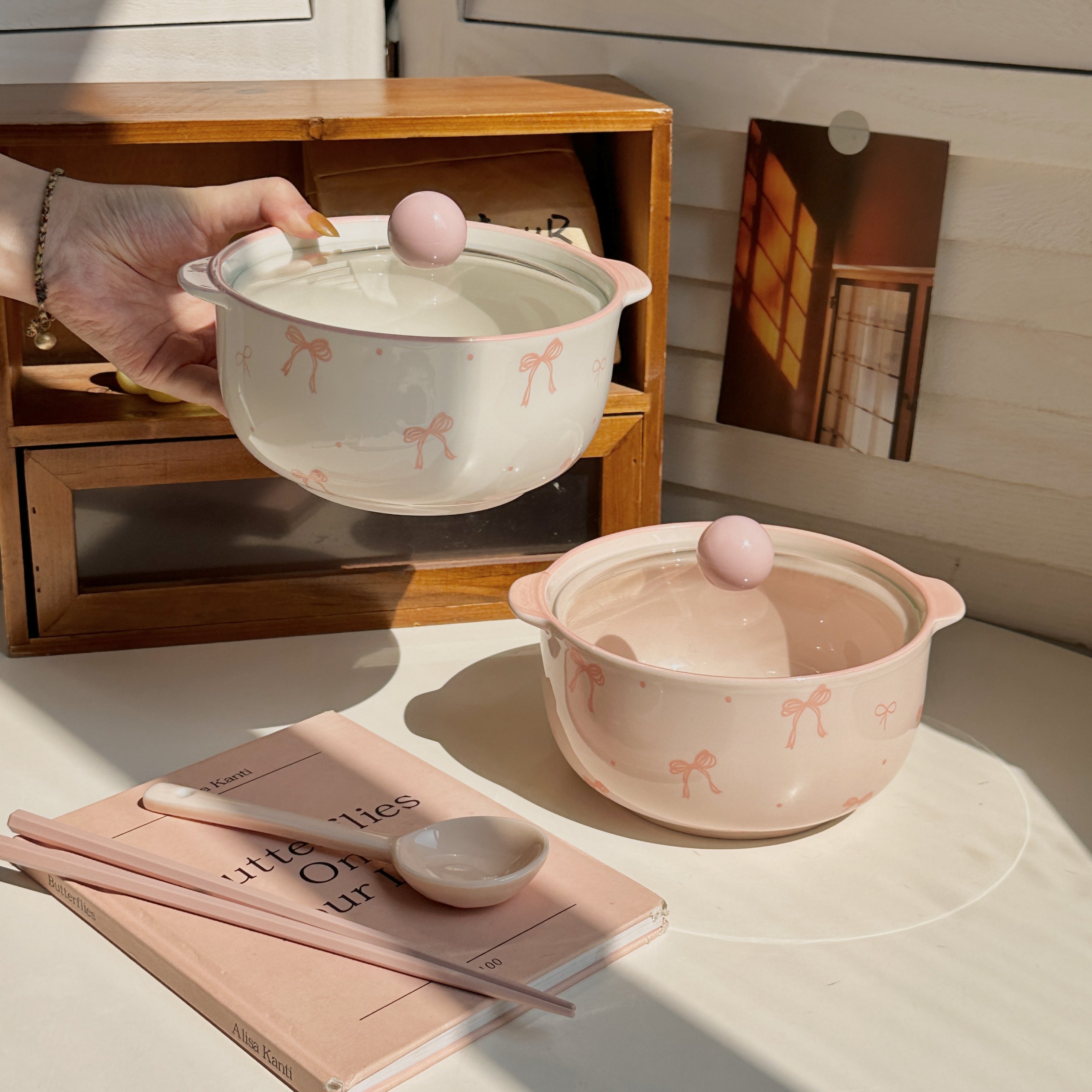 可爱蝴蝶结陶瓷带盖釉下彩双耳防烫学生宿舍泡面碗家用高颜值餐具