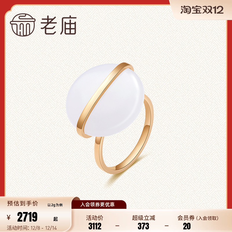 老庙黄金设计师方圆系列18K金镶玉圆形方糖戒指女款送礼物官方