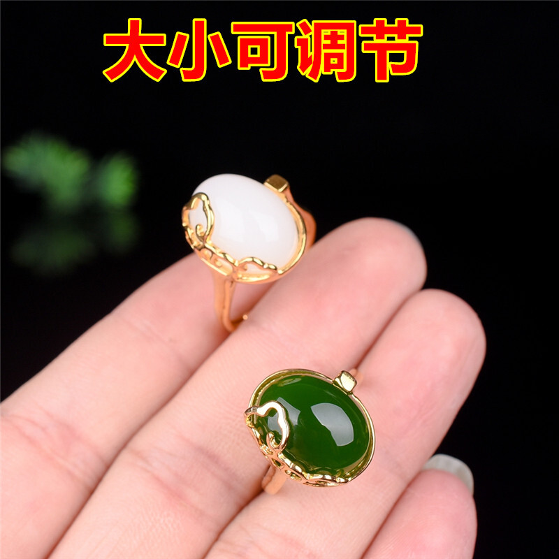 和田碧玉戒指女镶嵌925银俄罗斯玉活口可调送女友天然新疆金镶玉