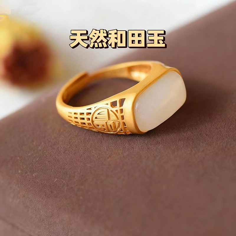 天然和田玉戒指金镶玉戒指女活口可调节不掉色食指戒指环戒指批发