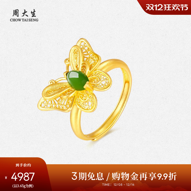 周大生黄金镶玉戒指女足金和田碧玉蝴蝶指环圣诞礼物送女朋友高级