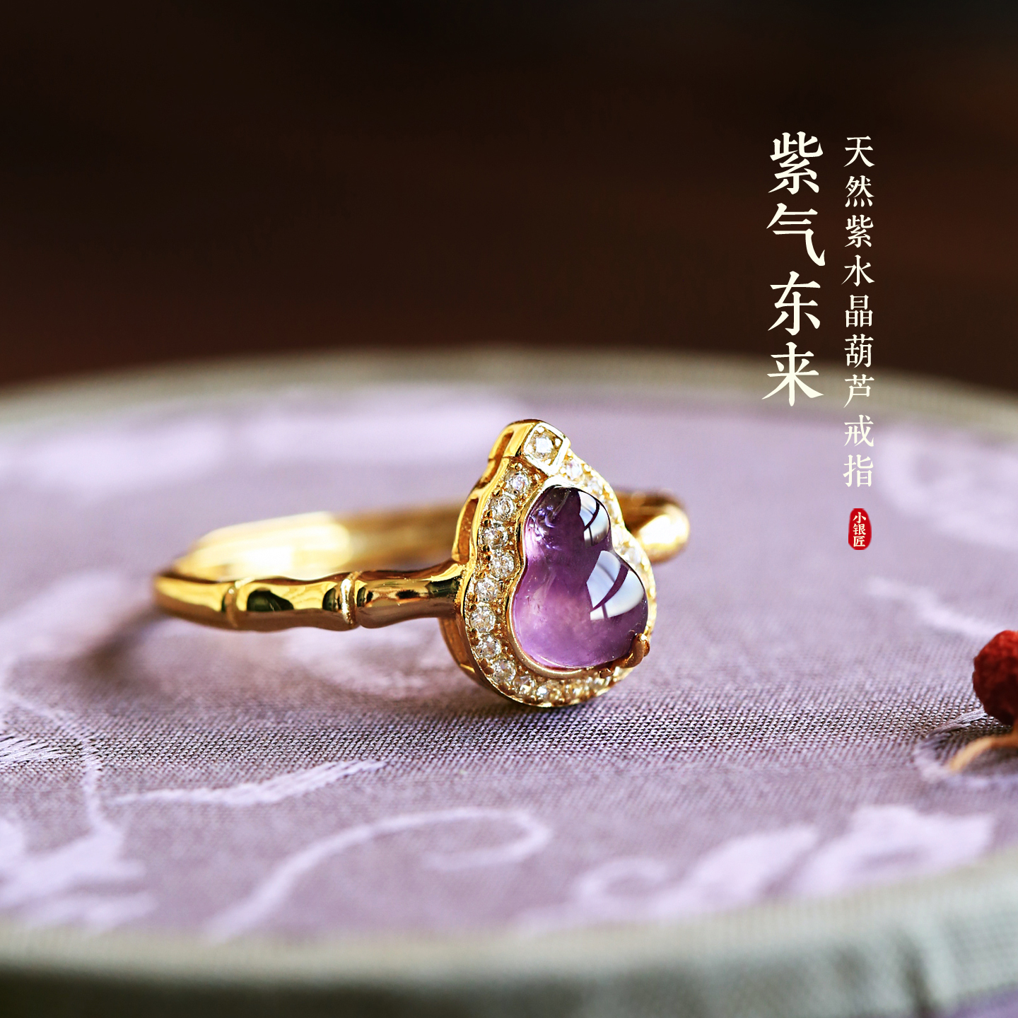 九紫离火天然紫水晶纯银开口竹节葫芦戒指女士国风紫色水晶金镶玉
