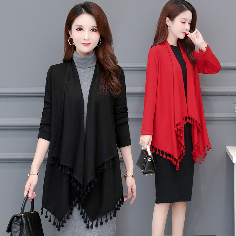 春秋针织外套女中长款加肥大码长袖宽松气质流苏开衫旗袍披肩外搭
