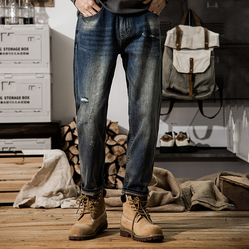 2025年冬季新款美式复古水洗破洞赤耳丹宁牛仔裤男锥形小脚九分