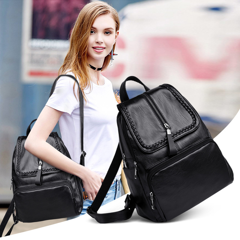 黑色新款潮流韩版时尚PU双肩包女士休闲背包学院风大容量双肩背包