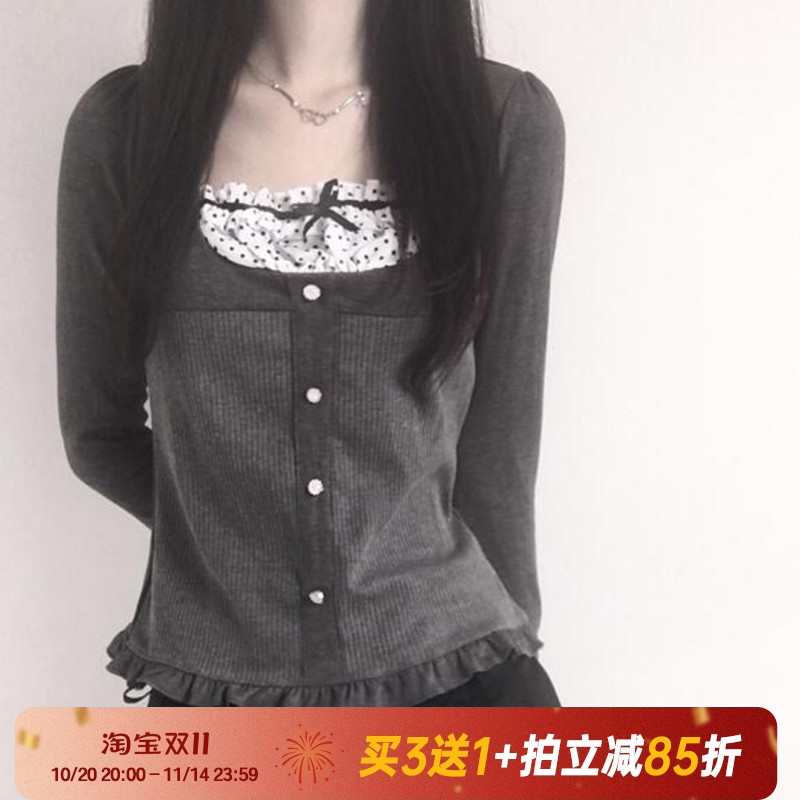 磨毛miu系蝴蝶结系带加厚长袖波点T恤女秋冬叠穿吊带马甲绝美上衣