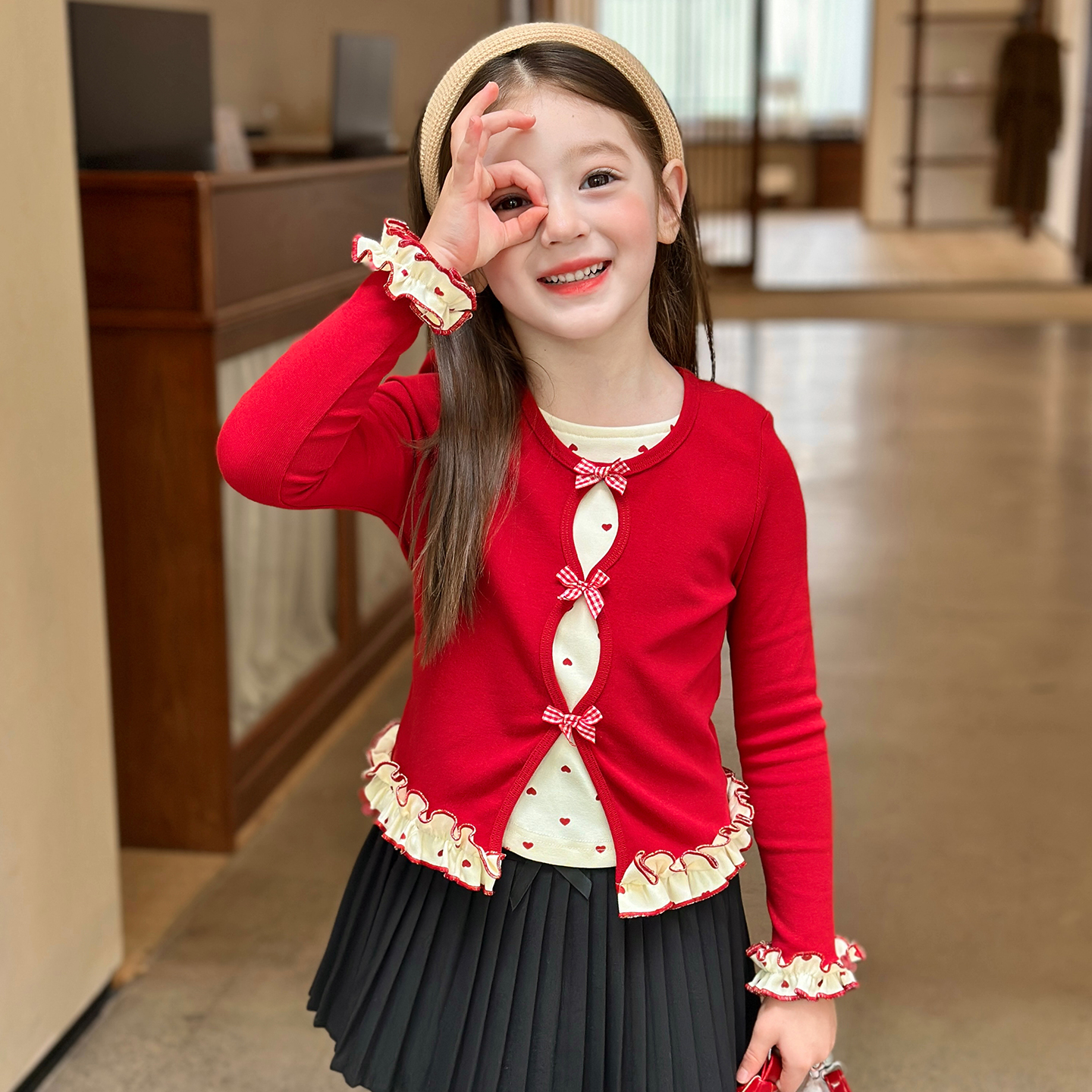 栀了成长记女童装红色假两件上衣2025秋季新款儿童蝴蝶结爱心T恤