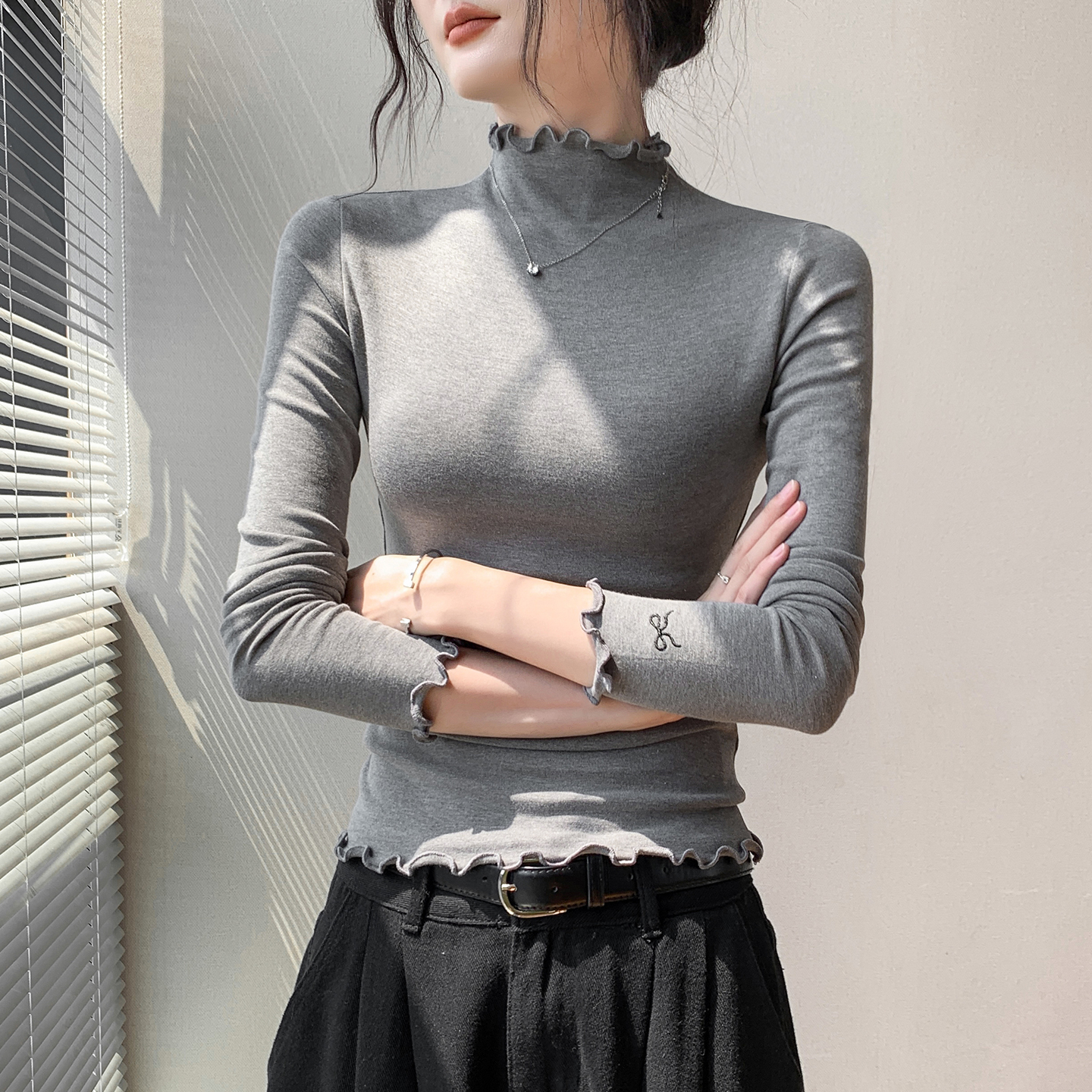 荷叶边半高领长袖T恤女秋季新款蝴蝶结刺绣内搭打底早秋高级上衣