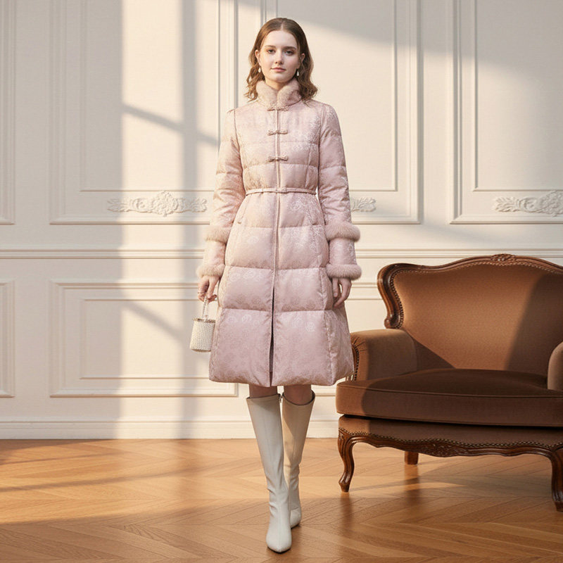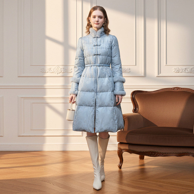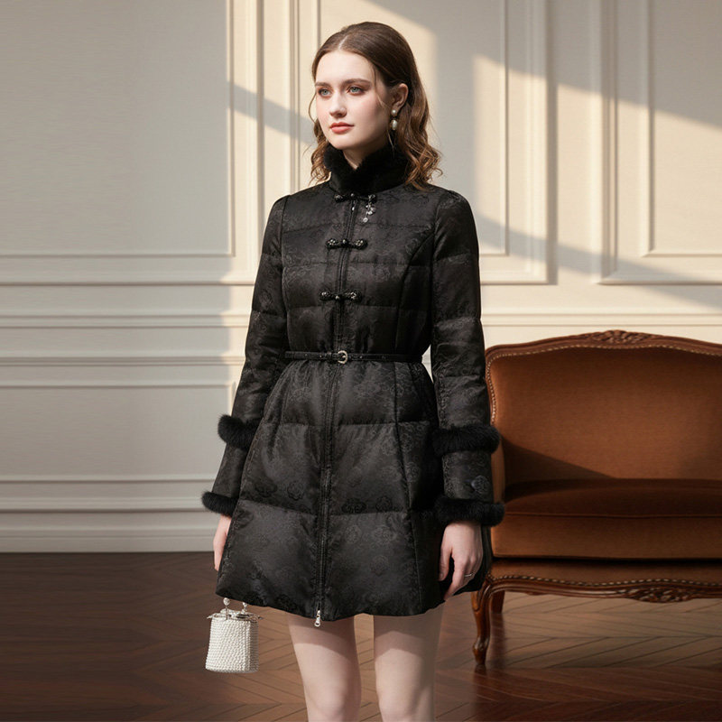 2025冬季新款高领收腰A字中长款国风提花獭兔毛条装饰羽绒服外套