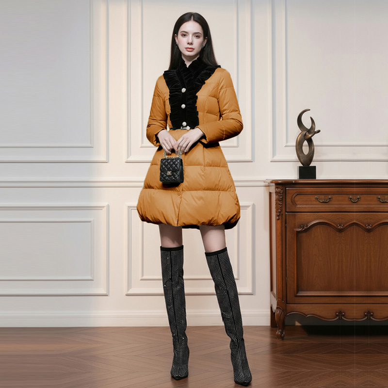 2025冬季新款时尚气质撞色木耳边拼接收腰中长A字防水羽绒服外套