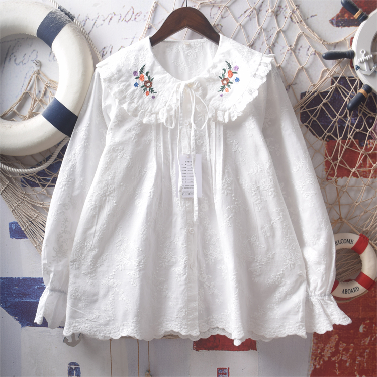 森系复古精美花朵刺绣娃娃领衬衫秋季长袖纯棉减龄娃娃衫打底上衣
